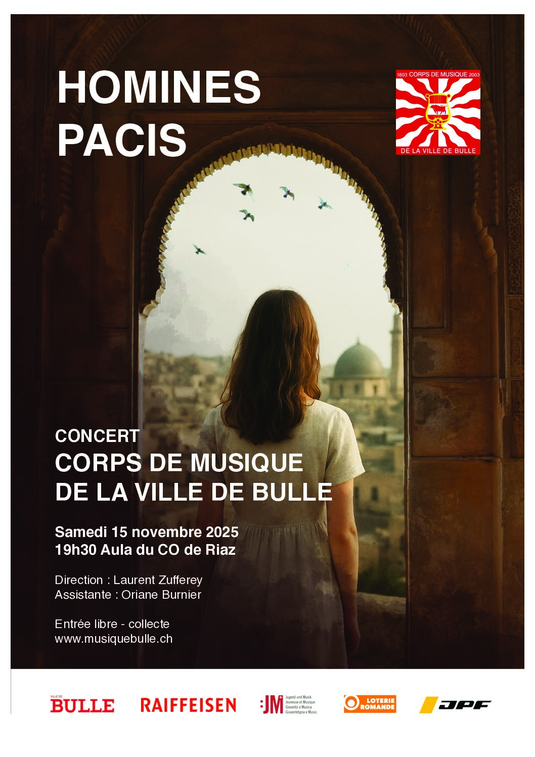 Concert Homines Pacis + Ajouter à mon Agenda Google + iCal / Outlook export 00 jours 00 heures 00 minutes 00 secondes Date Nov 15 2025 Heure 19:30 Lieu Aula du CO de Riaz Aula du CO de Riaz Catégorie CMB Partagez cet événement